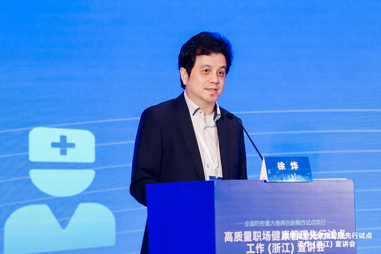 全国防控重大慢病创新融合试点项目管理委员会执行组负责人、高质量职场健康管理先行试点工作委员会执行组组长徐烨主任作《高质量职场健康管理先行试点落地实施方案》报告